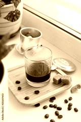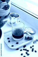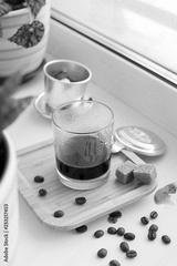 Black coffee with freshly roasted coffee beans on windowsiil in hipster coffee shop. Vietnamese style