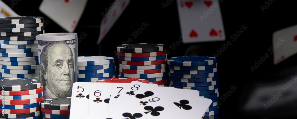 a roll of dollars, surrounded by casino gambling items, on a black background with flying cards