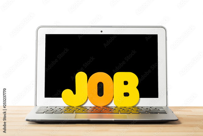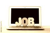 Conceptual workspace or business concept. Laptop computer with word Job from colorful letters against isolated white background.
