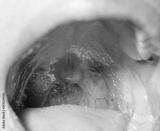 Sore throat with throat swollen. Closeup open mouth with posterior pharyngeal wall swelling and uvula and tonsil. Influenza follicles in the posterior pharyngeal wall. Upper respiratory tract.