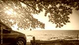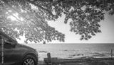 Blue sport SUV car parked by the tropical sea under umbrella tree. Summer vacation at the beach. Summer travel by car. Road trip. Automotive industry. Hybrid and electric car concept. Summer vibes.