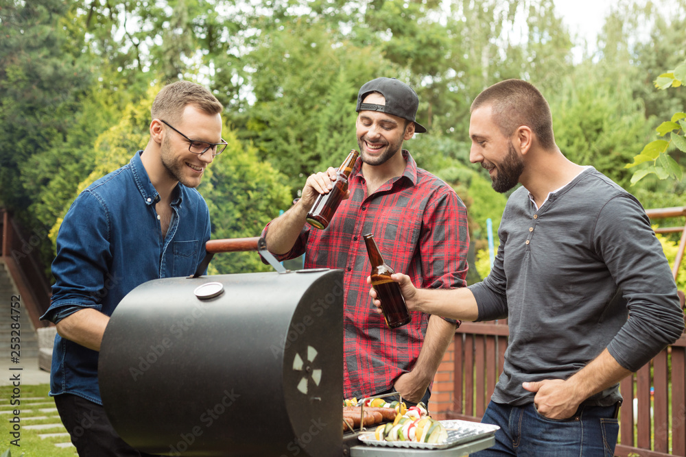 Happy friends preparing food on barbecue grill