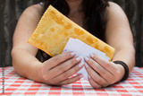Young woman holding brazilian snack known as Pastel - asian recipe.
