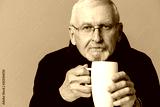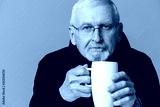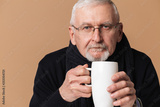 Old handsome man with gray hair and beard in eyeglasses and scarf thoughtfully looking in camera holding big mug with tea in hand over beige background isolated