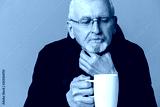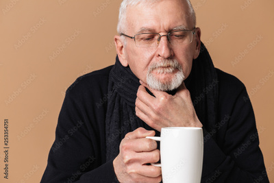 Old sick man with gray hair and beard in eyeglasses and scarf with big cup with tea while holding hand near throat over beige background