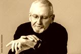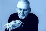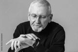Old handsome man with gray hair and beard in eyeglasses and sweater dreamily looking on hand watch over blue background isolated