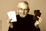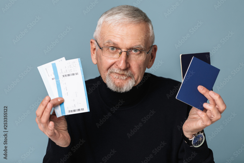 Old smiling man with gray hair and beard in eyeglasses and sweater holding tickets and passports in hands while happily looking in camera over blue background