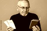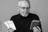 Old pensive man with gray hair and beard in eyeglasses and sweater thoughtfully holding tickets and passports in hands over blue background isolated