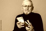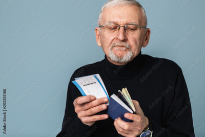 Old attractive man with gray hair and beard in eyeglasses and sweater thoughtfully holding tickets and passports in hands over blue background isolated