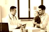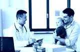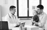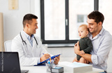 medicine, healthcare, pediatry and people concept - happy father with baby daughter and doctor with clipboard at medical office in hospital