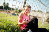Music and fitness. Young woman in sports wear with headphones exercising
