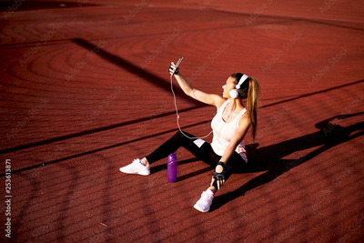 Music and fitness. Young woman in sports wear with headphones exercising and taking a selfie