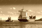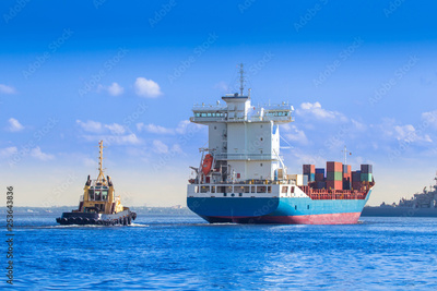Cargo Ship. The ship carries cargo. Container ship. The tug boat navigates through the fairway. Maritime supply routes. Fairway in the port.