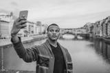 Young man take a selfie in front of Ponte Vecchio, Florence