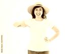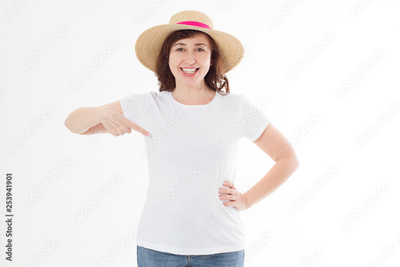 Summer t shirt design and people concept close up of woman in blank template white t-shirt and beach hat point on copy space on white tshirt. Mock up. Front view.