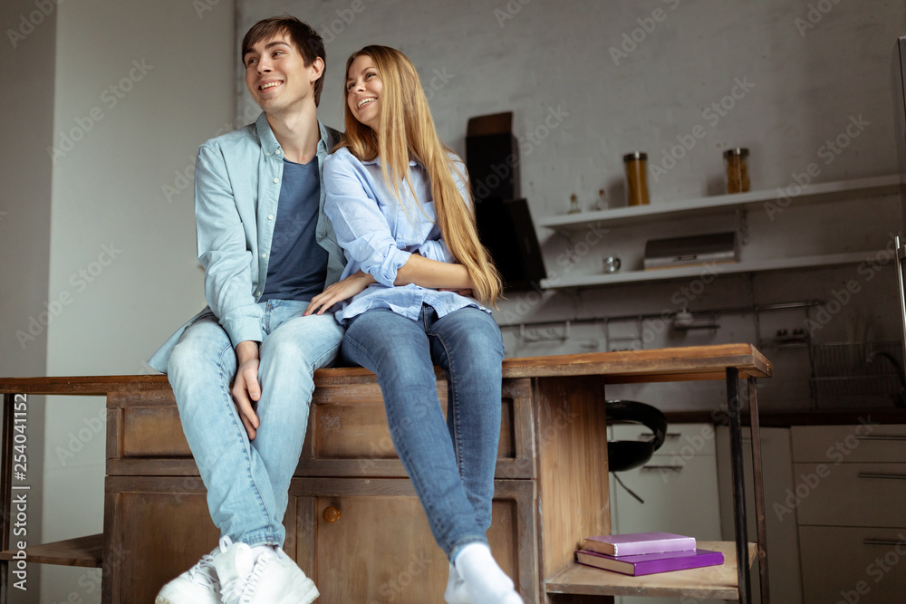 Happy smiling young couple in blue denim cloth sitting in the kitchen