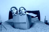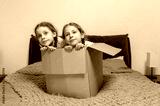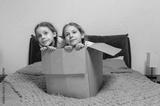 Moving to new apartment. Happy children girls hid in a cardboard box