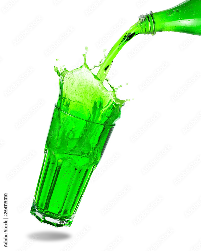 Pouring green soda from bottle into glass with splashing isolated on white background.