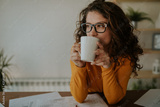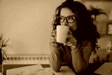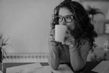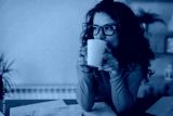 Close up of a young woman drinking coffee at her desk, looking away, thinking.