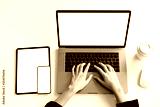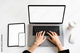 Woman using laptop and tablet, phone placed on the table, mock up of blank screen. Concept of future and trend internet for easy access to information.