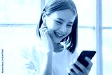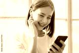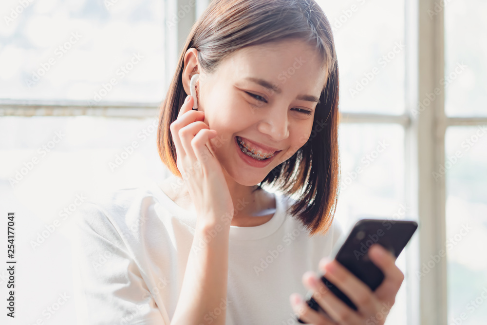 Women are listening to music from white headphones. And using hands touch to use various functions, happy mood.