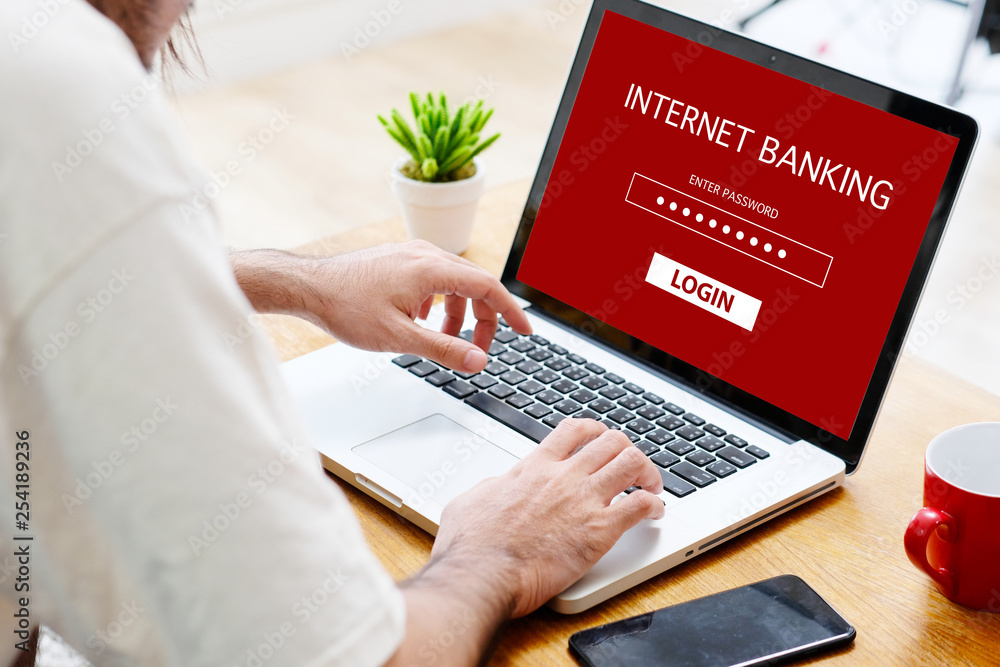 Man hand tying laptop computer with online bank account password login on screen at home, online baking cyber security concept