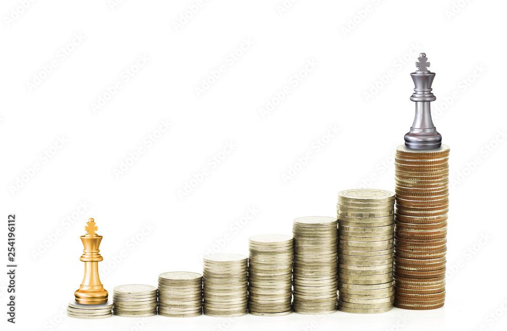 Finance and successful investment concept, stacked of coin king gold and silver chess