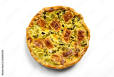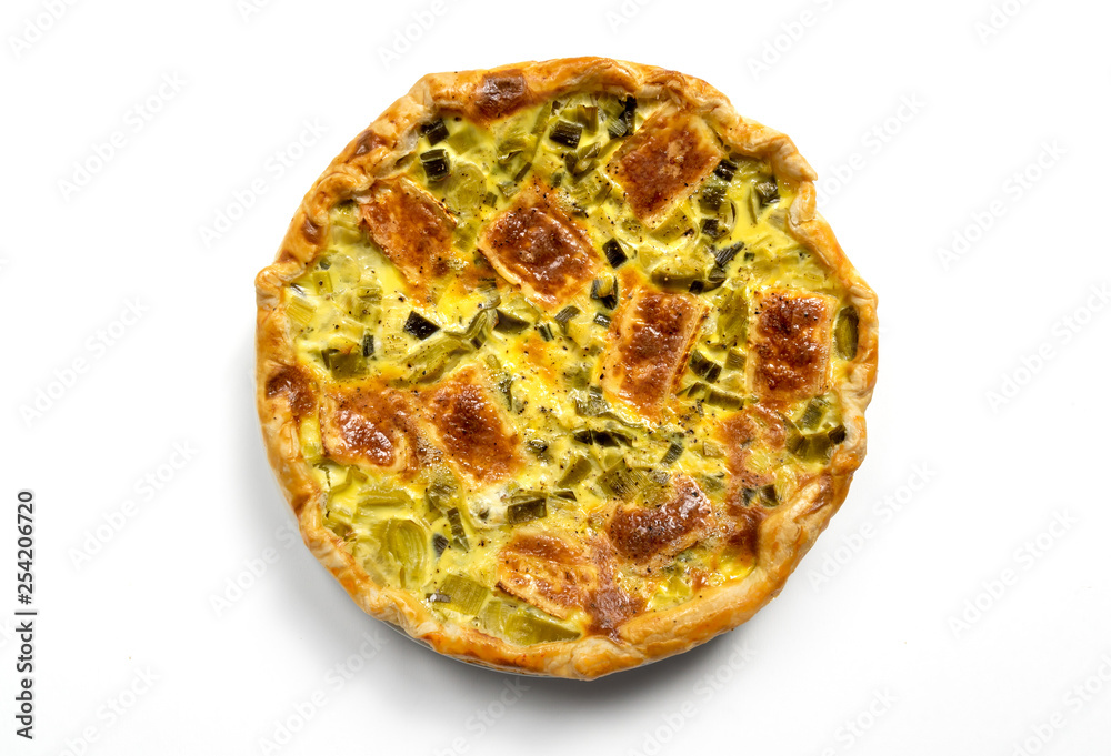 Homemade vegetarian savory pie with puff pastry stuffed with vegetables and cheese, isolated on white background, top view.