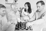 Happy family chess game time at nursing home for elderly. Parents with children have fun talk and leisure. Senior couple and relatives. Visit old mother father. Parenting care concept. Selective focus