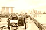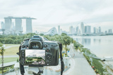 Travel photographer shooting landscape of singapore city during the sunset with professional DSLR camera.