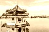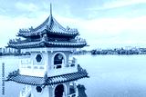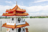 The Twin Pagodas on Jurong Lake, in the Chinese Garden with cloudy sky in Singapore..