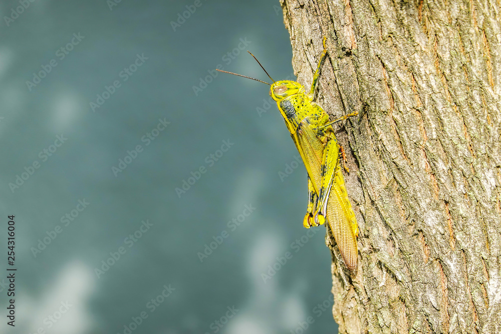 Macro of yellow grasshopper climbs on leaves and a tree.