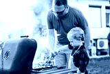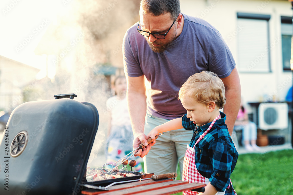 Father teaching his little son how to grill while standing in backyard at summer. Family gathering concept.