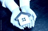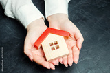 A woman is protecting a miniature wooden house with a red roof. Property insurance concept. Protection of housing. Security and safety family and life. Insurance agent services. Support