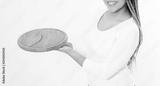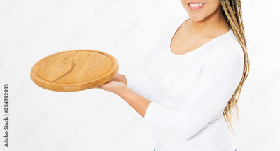 Young attractive african american woman holding empty wood pizza cutting board isolated on white background. Copy space and mock up. Blank template background. Top view