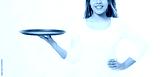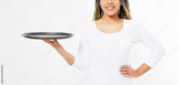 Young attractive woman holding empty pizza tray isolated on white background. Copy space and mock up. Blank template background.