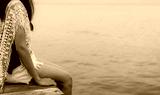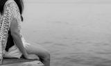 Pensive lonely adult Asian woman. Back view of woman with sad feeling in black and white scene at the sea. Depressed and stressed girl sit on wooden pier at the sea. Hopeless and despair. Suicide