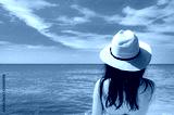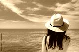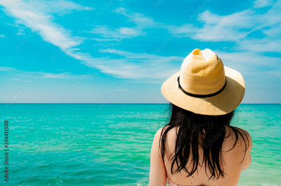 Back view of sexy and happy young Asian woman wear straw hat relaxing and enjoy holiday at tropical paradise beach. Girl standing at the beach and looking the sea in summer vacation. Summer vibes.