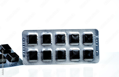 Medical pastille for relief cough, sore throat and throat irritation isolated on white background. Cough and colds drop. Black cough herbal extract lozenges in blister pack. Square candy or sweets.