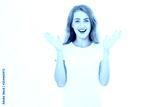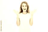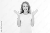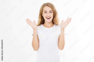 Wow effect. Surprised shocked excited caucasian woman wow face isolated on white background. Young girl in summer t shirt. Copy space