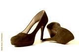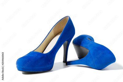 Closeup of fashionable high heels shoes isolated on white background. Blue color woman shoe on floor. Shopping and fashion concept. Copy space. Selective focus