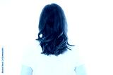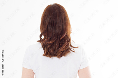 Hair care after dyeing. Brunette woman rear hairstyle view. Closeup of woman head with curls and waves isolated on white background. Back template t shirt view. Copy space