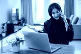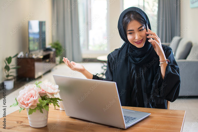Beautiful arab young woman in abaya having conversation via mobile phone while sitting near laptop at her luxury accommodation