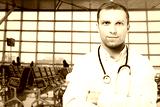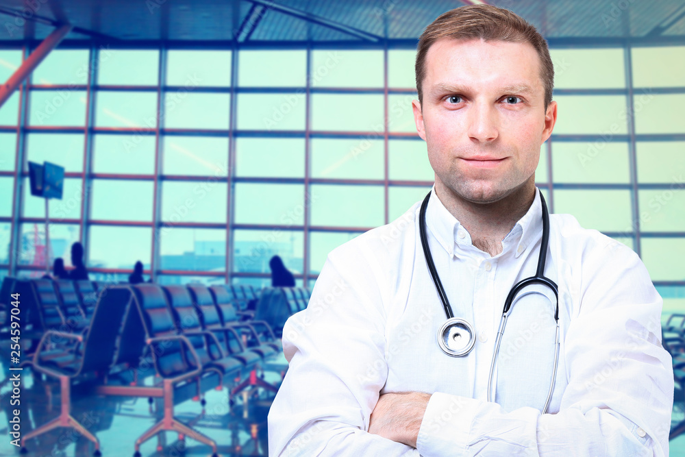 Portrait of doctor with stethoscope in clinic hall. Medical worker in hospital