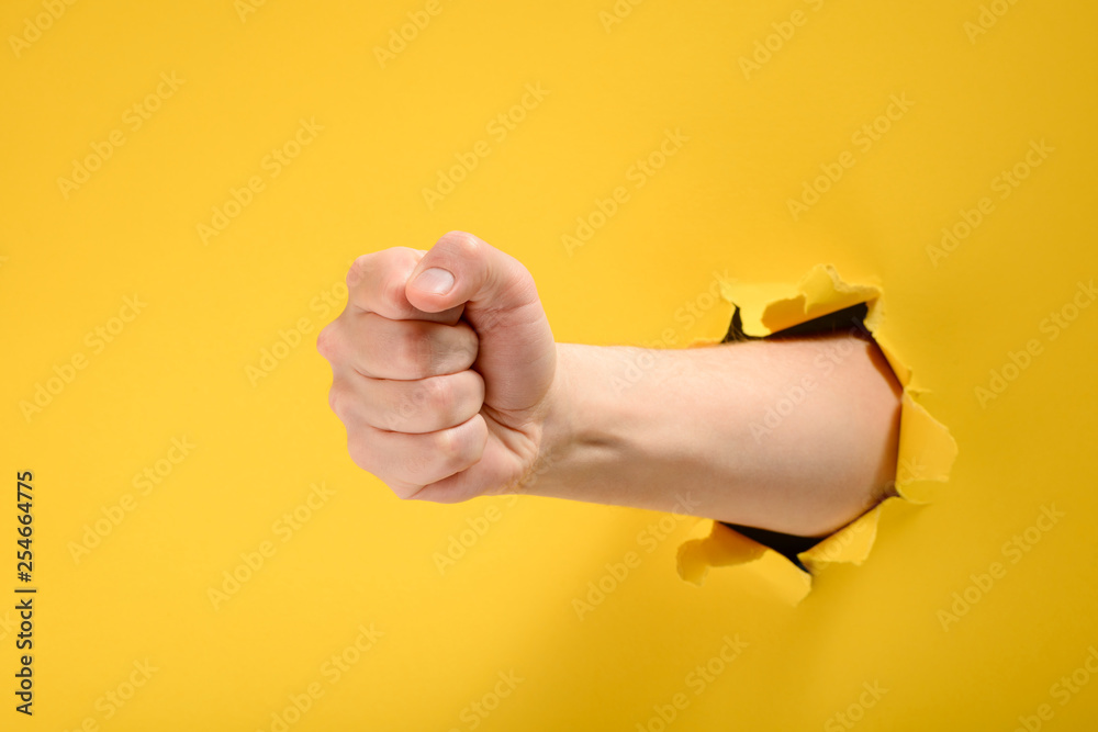 Fist punching through yellow paper