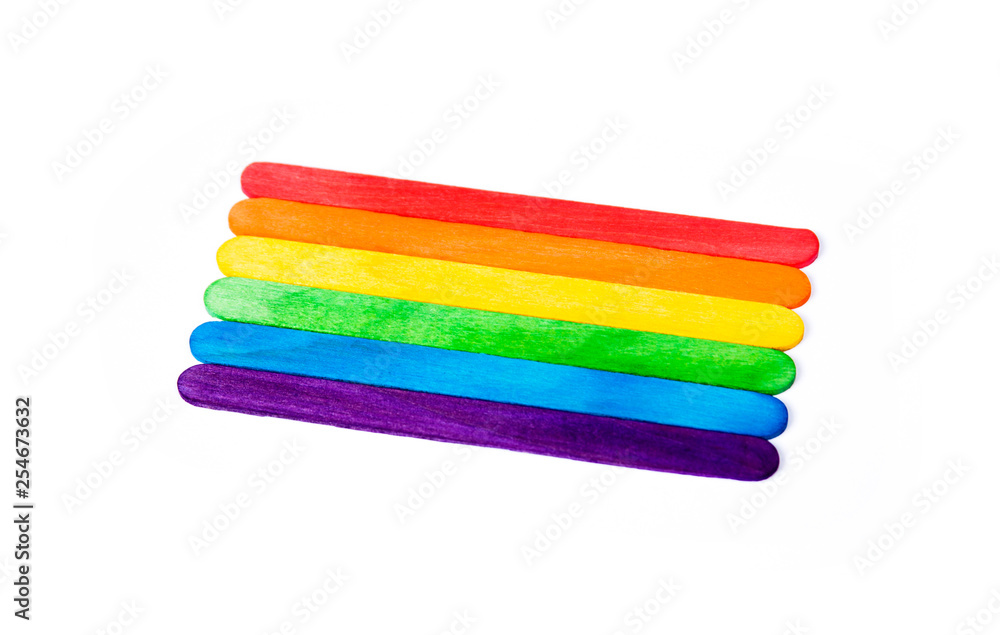 Colorful vivid rainbow made of popsicle sticks, school color learning concept, symbol of diy crafts, fun, freedom, lgbt. Isolated on white background.