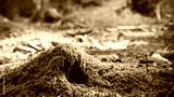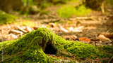 An animal burrow in the forest covered with moss, a warm sunny day.