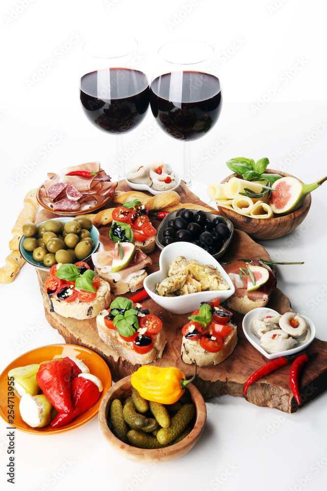 Italian antipasti wine snacks set. Cheese variety, Mediterranean olives, pickles, Prosciutto di Parma, tomatoes, artichokes and wine in glasses