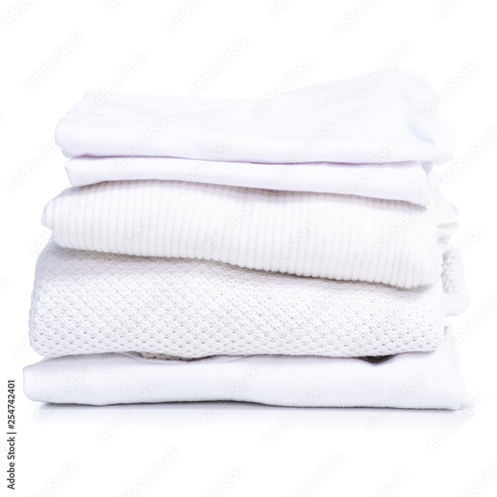 Stack white clothes t-shirt, sweater, jeans on white background isolation
