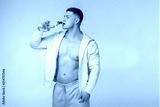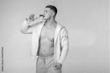 Fitness man in gray sportswear with naked torso